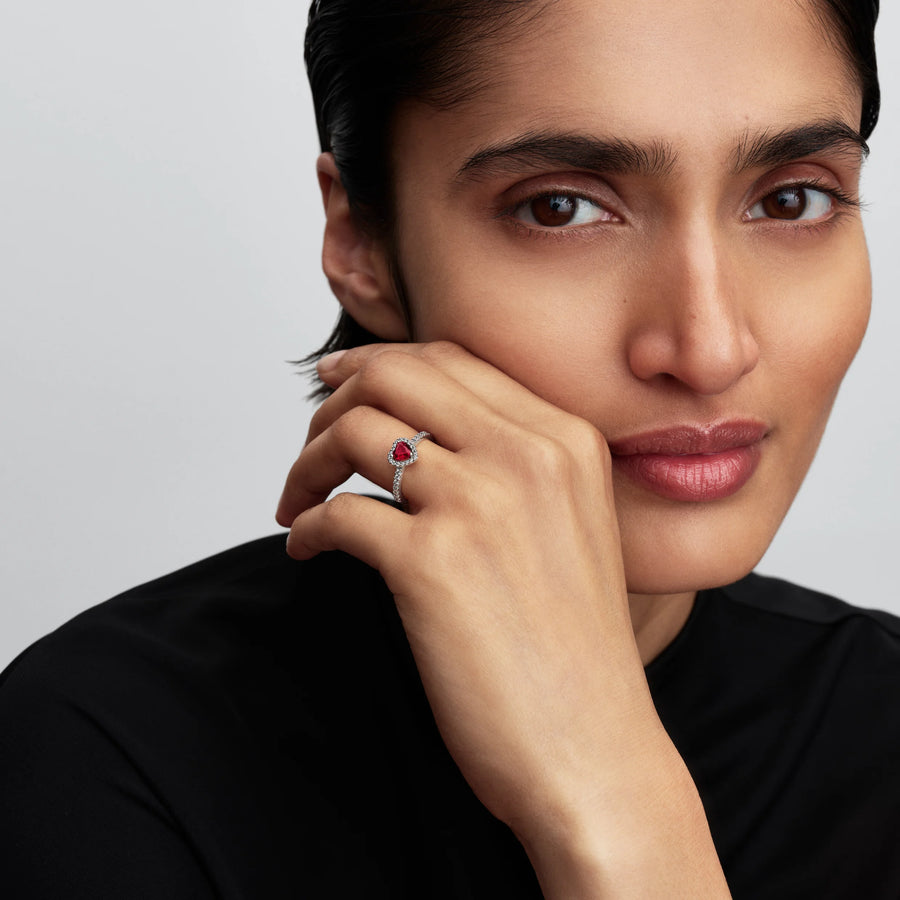 Spindesys visa širdimi. Iš sterlingo sidabro pagamintas žiedas papuoštas širdies formos ryškiai rožiniu iškiliu dirbtiniu kristalu, apsuptu pavé aureole, ir pusiau pavé stiliumi inkrustuotu lankeliu. Meilės ir dėkingumo įkvėptas papuošalas, kurį tinka derinti su kitais žiedais.