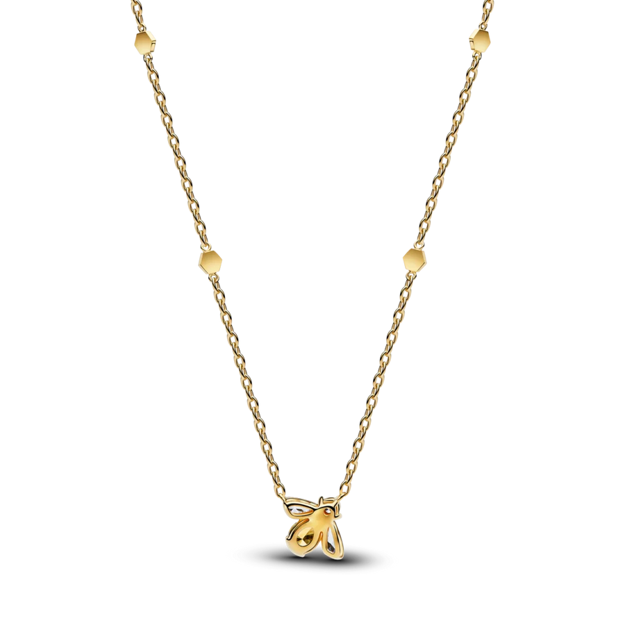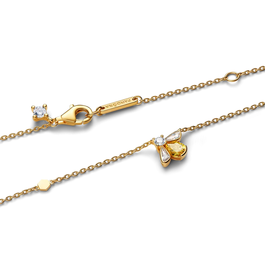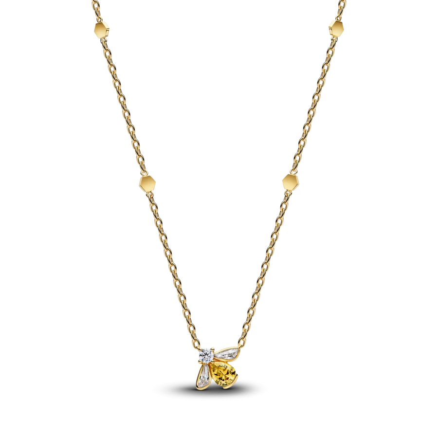 Tegul jūsų stilius dūzgia. Mūsų 14 karatų auksu padengtas vėrinys yra papuoštas iš ryškiai geltonų ir skaidrių akmenėlių sukurta bite, kuri pritvirtinta prie grandinėlės su medaus korio detalėmis. Saldžiai spindintis papuošalas, tinkantis bičių karalienei.