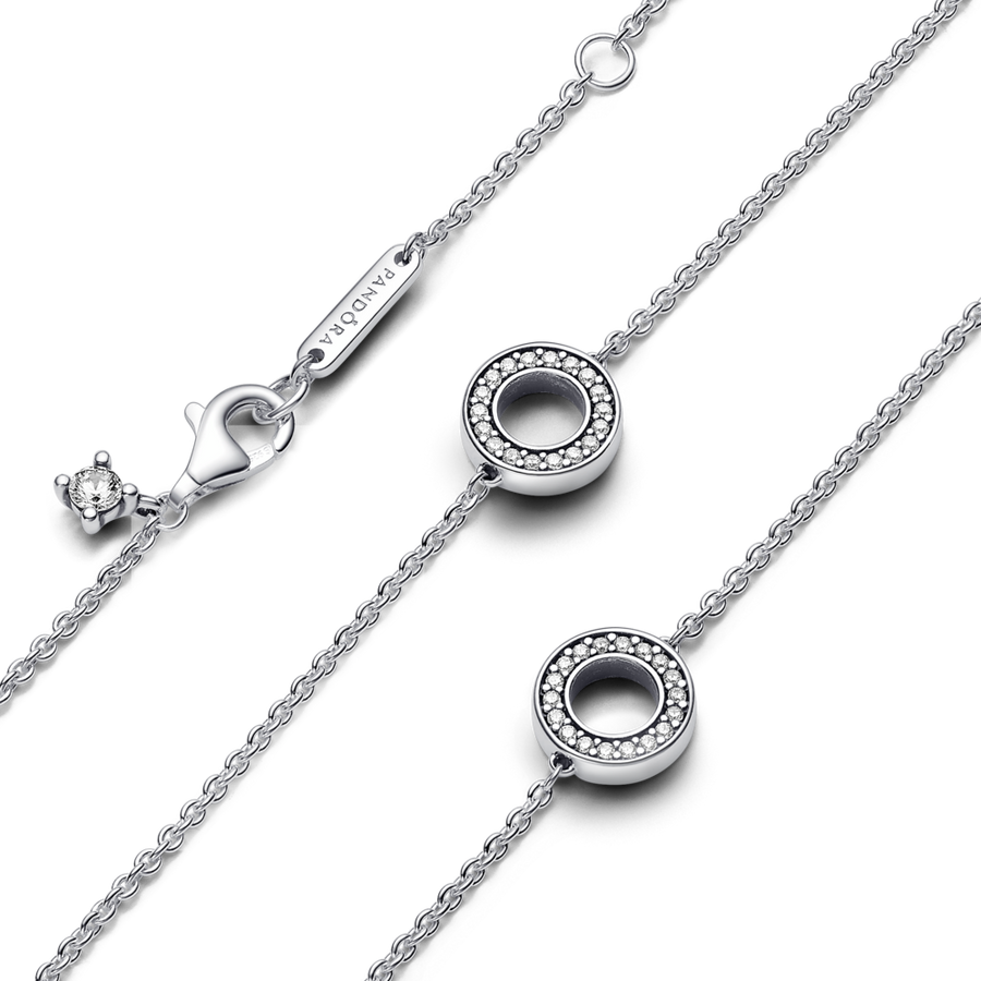 Susikurk išskirtinį stilių su PANDORA kaklo grandinėle su apskritimais, papuoštais pavé stiliumi inkrustuotais akmenėliais. Tai universalaus dizaino sidabrinis papuošalas su trimis apskritimais, dekoruotais pavé stiliumi inkrustuotais akmenėliais ir tolygiai išdėstytais ant grandinėlės vienodu atstumu vienas nuo kito. Apskritimų šonai glotnūs, kiekvienas apskritimas papuoštas skaidrių kubinio cirkonio akmenėlių eilute, kurią pabrėžia iškili lygi linija. Vėrinio ilgį galima reguliuoti, tai puikus papuošalas bet kokiam aprangos stiliui. Šis kaklo vėrinys su žėrinčių pavé stiliumi inkrustuotų akmenėlių aureolėmis idealiai tinka pasipuošti kasdien ir puikiai dera prie kitų kaklo vėrinių, norint susikurti išskirtinį įvaizdį.