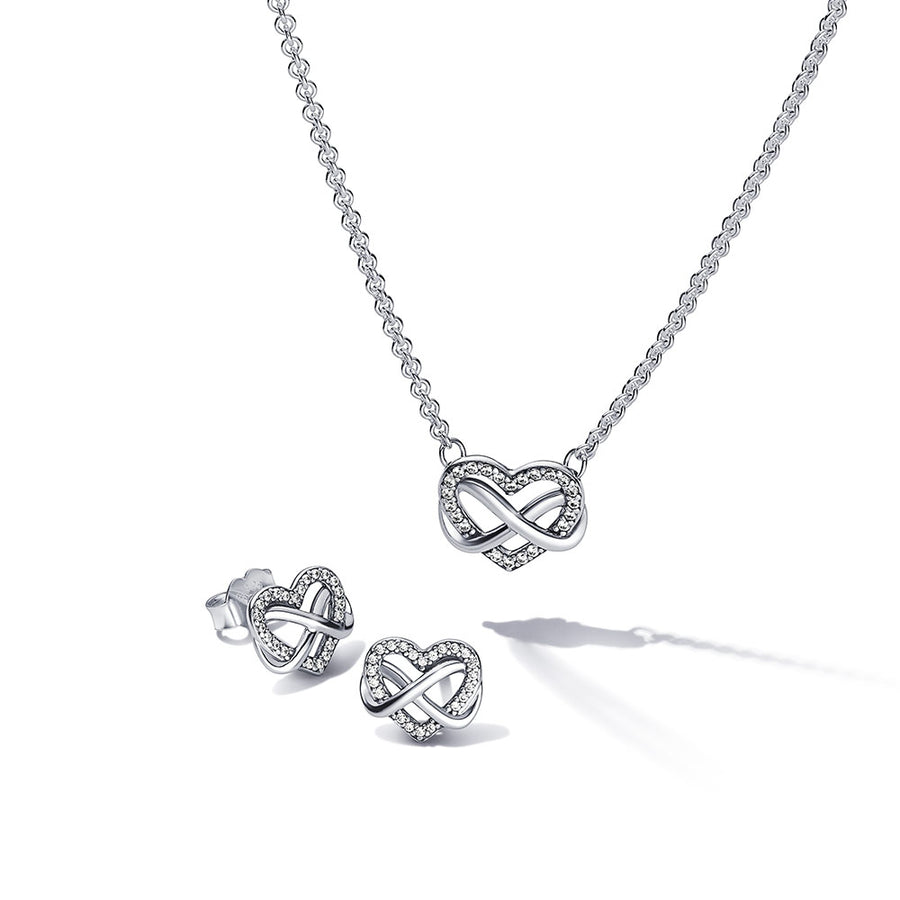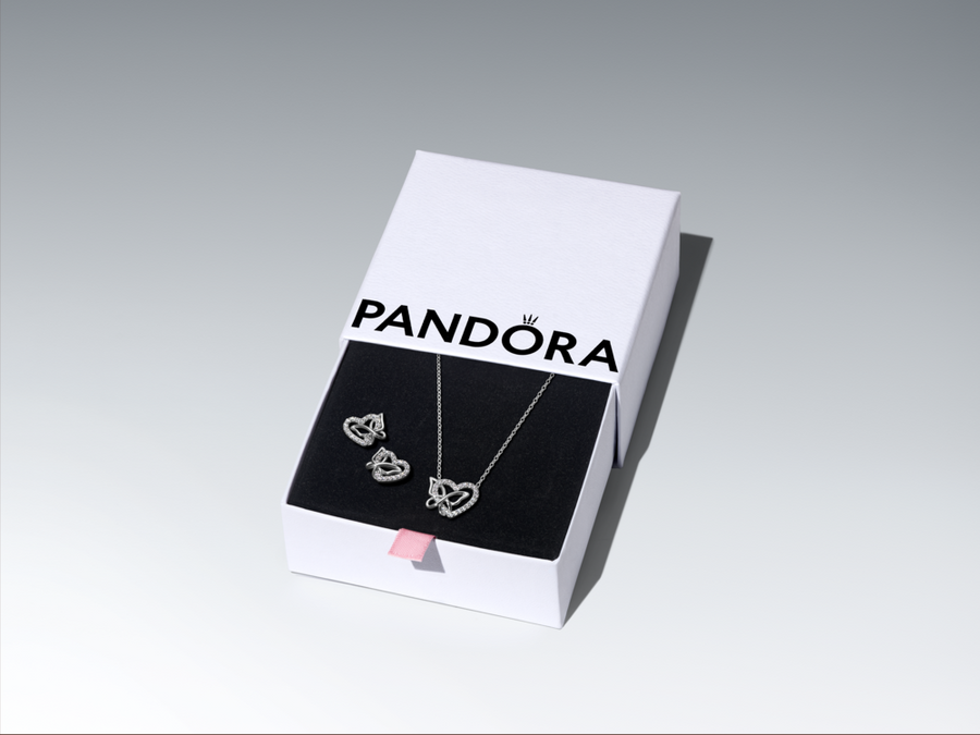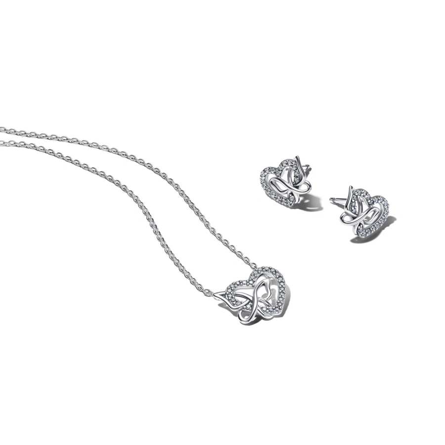 Švęskite gamtos grožį ir meilės jėgą su mūsų suderintų „Pandora Moments“ dovanų rinkiniu, kurį sudaro kaklo vėrinys ir auskarai, papuošti persipynusiais širdimi ir drugeliu. Kiekvienas papuošalas, pagamintas iš prabos sidabro ir dekoruotas spindinčiais akmenėliais, sukurtas taip, kad atspindėtų šviesą tarsi skraidančio drugelio sparnai.