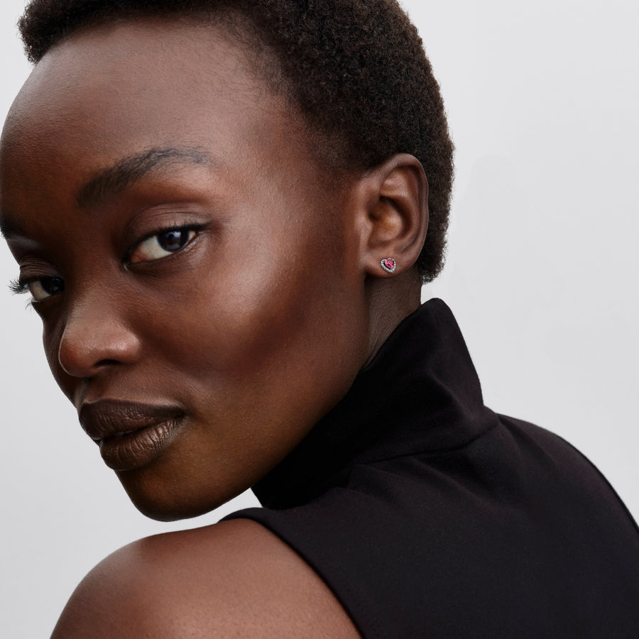 Meilė slypi detalėse. Sidabriniai auskarai, parduodami poromis, dekoruoti raudonu širdies formos akmenėliu centre. Iškili širdis, apsupta skaidrių kubinių cirkonių, gaudo šviesą.
