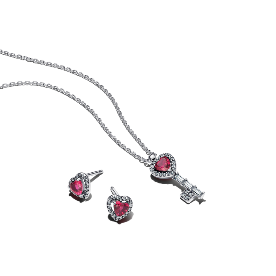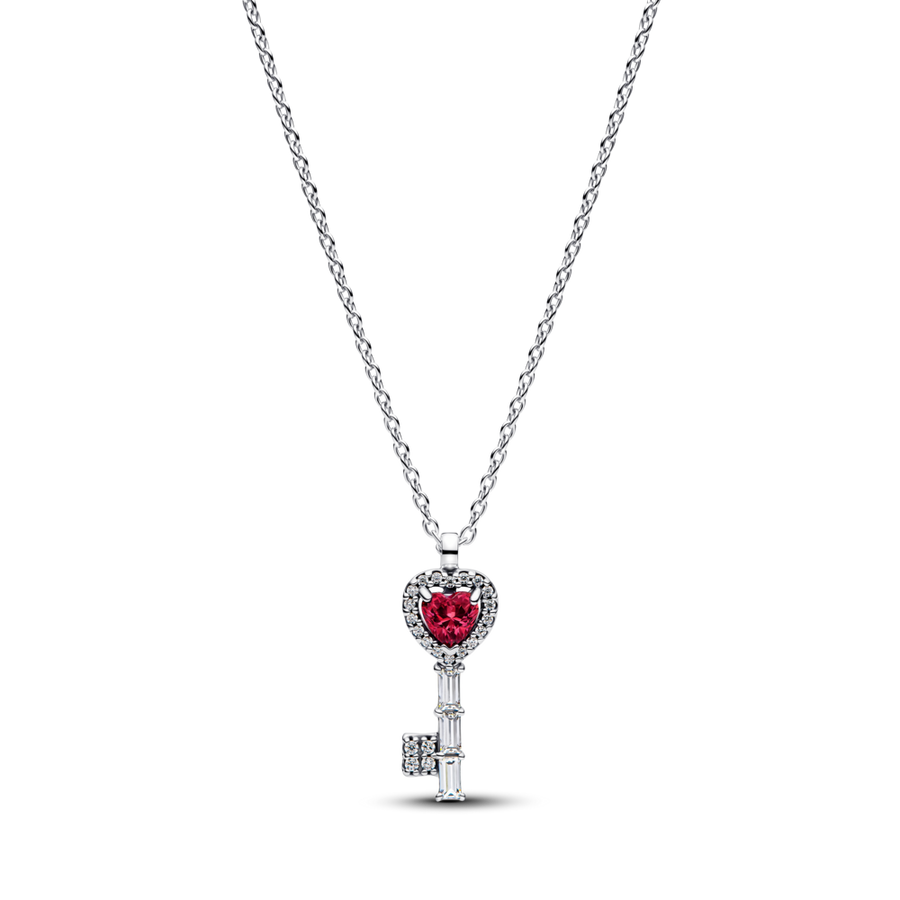 Atrakinkite spindesį. Sidabrinis širdies formos rakto pakabutis papuoštas ryškiai raudonu kristalu, apsuptu skaidriais kubiniais cirkoniais. Galima nešioti trijų skirtingų ilgių, todėl tinka derinti prie bet kokio įvaizdžio.